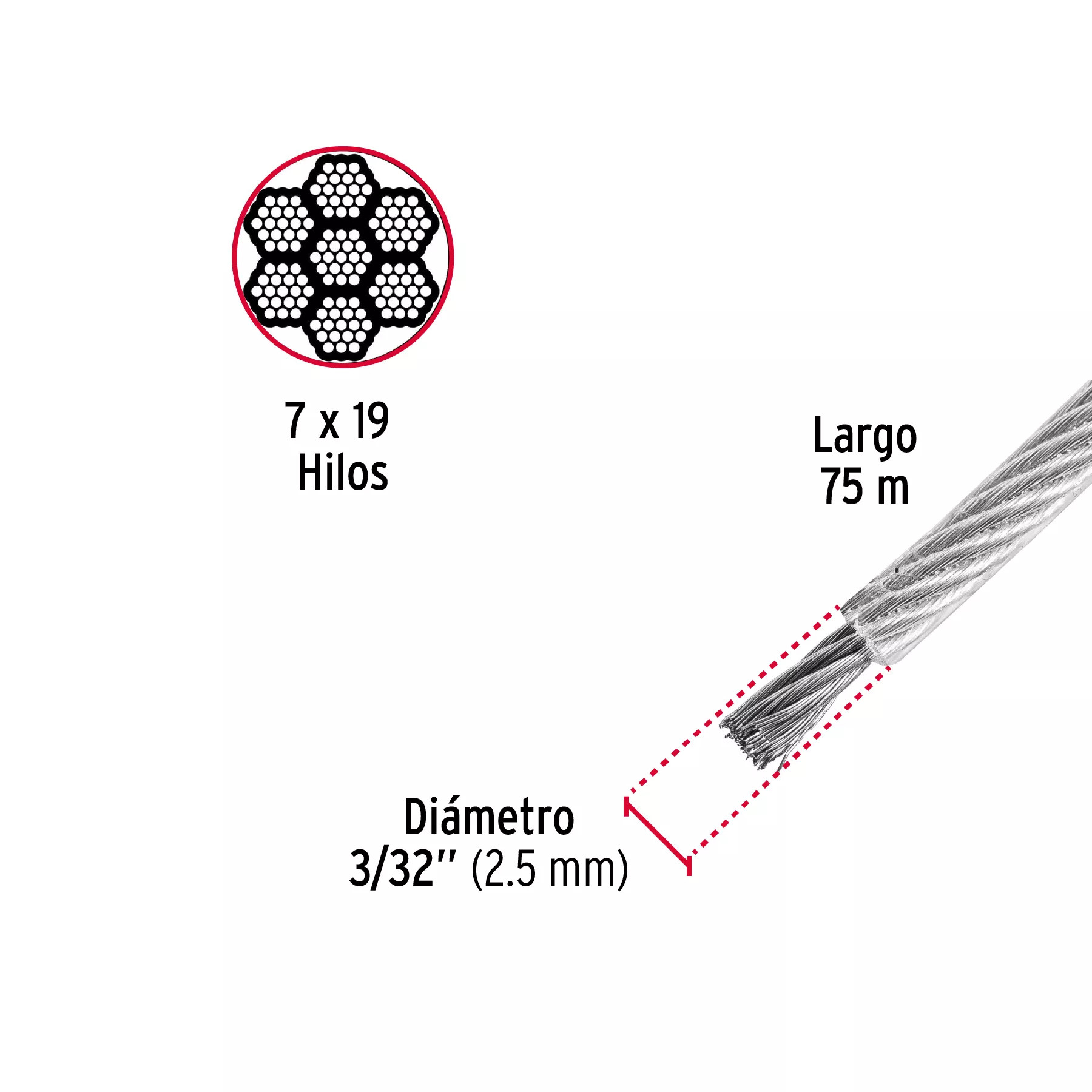 Calidad y Durabilidad Inigualables: Este cable cuenta con un núcleo de acero 7x19, lo que le confiere una resistencia superior a la tensión y flexibilidad extrema, ideal para aplicaciones donde el movimiento es constante. Además, está recubierto con PVC, protegiendo el cable del desgaste y la corrosión, garantizando una larga vida útil incluso en condiciones adversas.