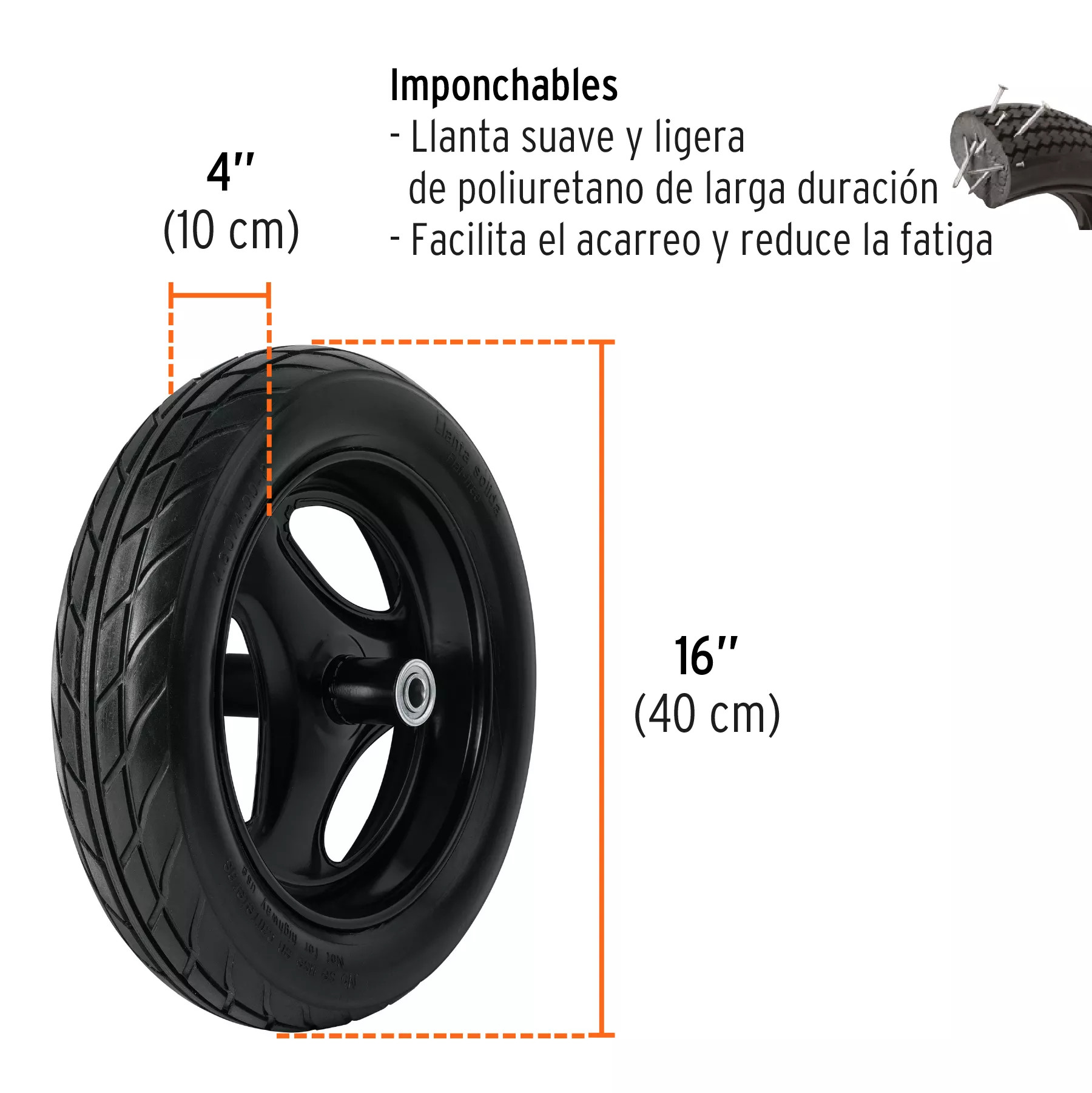 - Rueda imposibilitante de pinchaduras: Elimina el riesgo de detenerse por pinchazos, ofreciendo mayor continuidad en el trabajo.