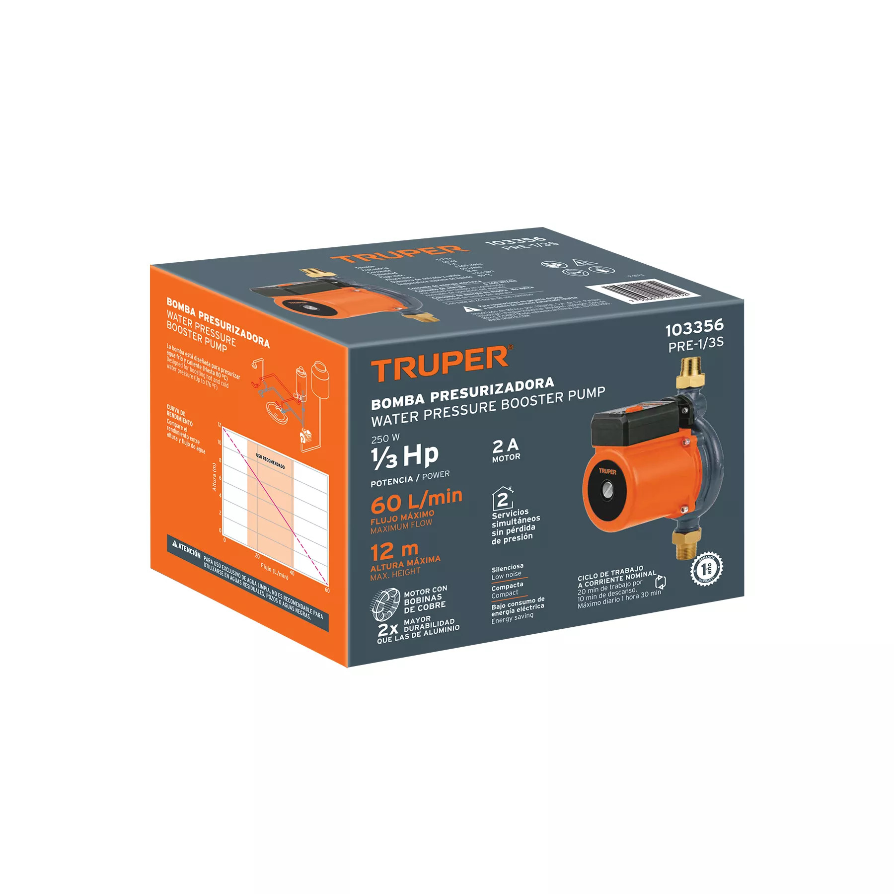 La Bomba presurizadora 1/3 HP de Truper es la solución ideal para mantener una presión de agua constante en tu hogar o negocio. Con su potente motor de 1/3 HP, esta bomba garantiza un rendimiento eficiente y duradero, perfecta para aplicaciones residenciales y comerciales. Aumenta la comodidad de tu sistema hídrico y asegura un flujo constante de agua, confiando en la calidad que solo Truper puede ofrecer.