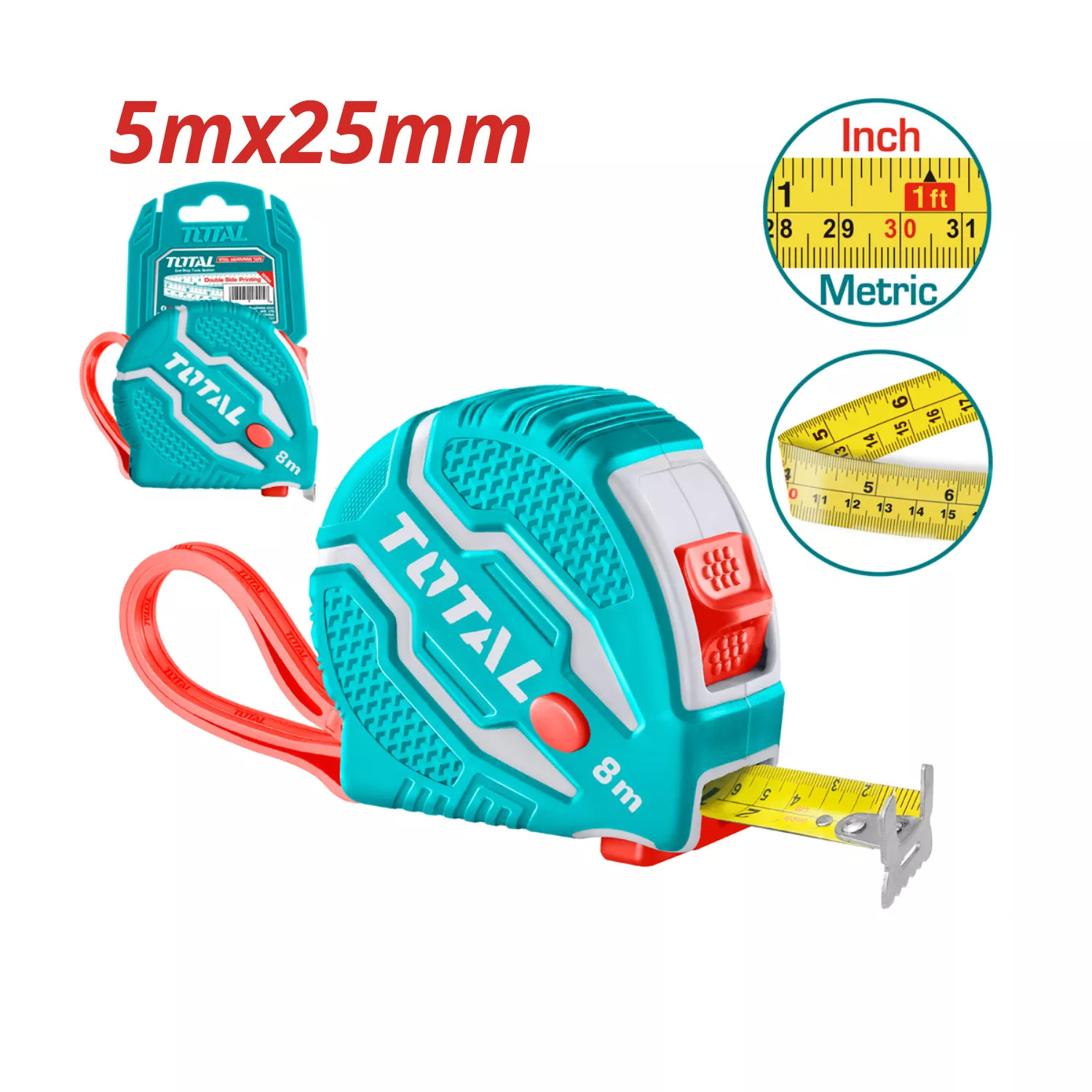 Cinta métrica TOTAL de 5 metros x 25 mm, diseñada para mediciones precisas en trabajos domésticos e industriales. Cuenta con escalas en sistema métrico y pulgadas, además de botón de triple fijación para mayor control. Su funda de goma brinda protección y durabilidad en el uso diario.