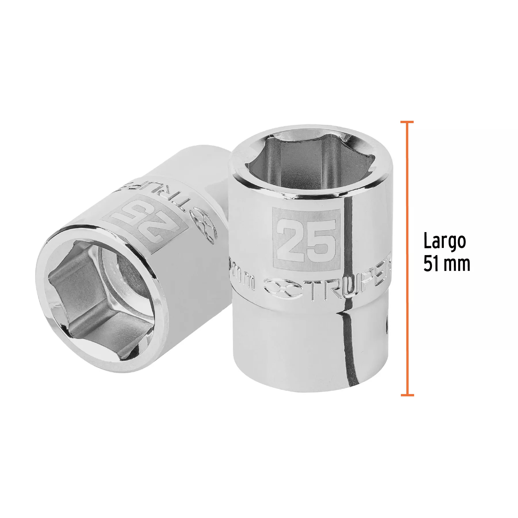 El Dado de 25 mm con 6 puntas y cuadro de 3/4" de Truper está diseñado para aplicaciones de alto torque, proporcionando precisión y fiabilidad en tareas de ajuste y montaje en diversos entornos industriales y de reparación.