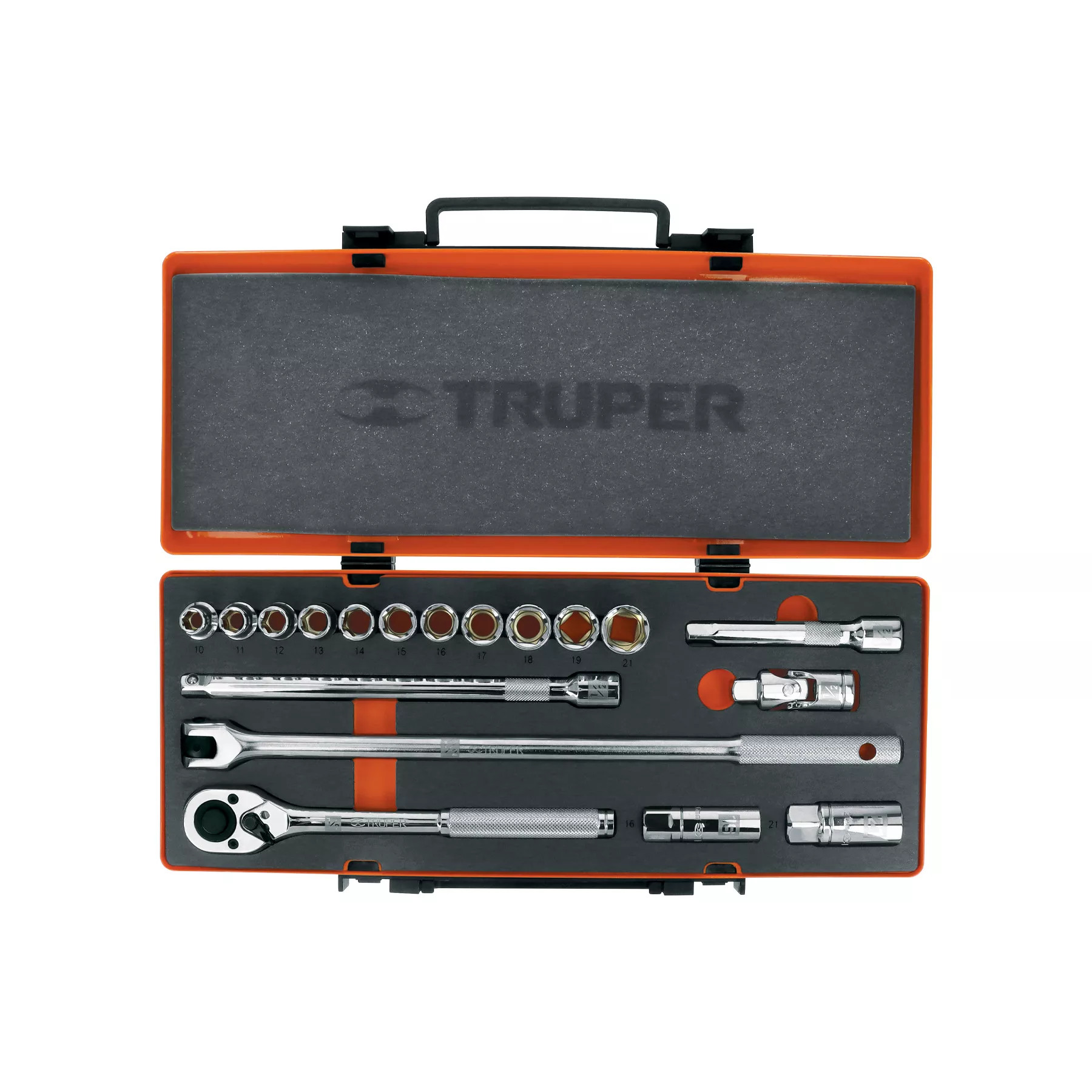 El Juego de 18 Herramientas Cuadro 1/2' MM de Truper ofrece la solución integral para mecánicos profesionales y aficionados. Con piezas de alta precisión y durabilidad, garantiza eficiencia y confiabilidad en cada tarea.