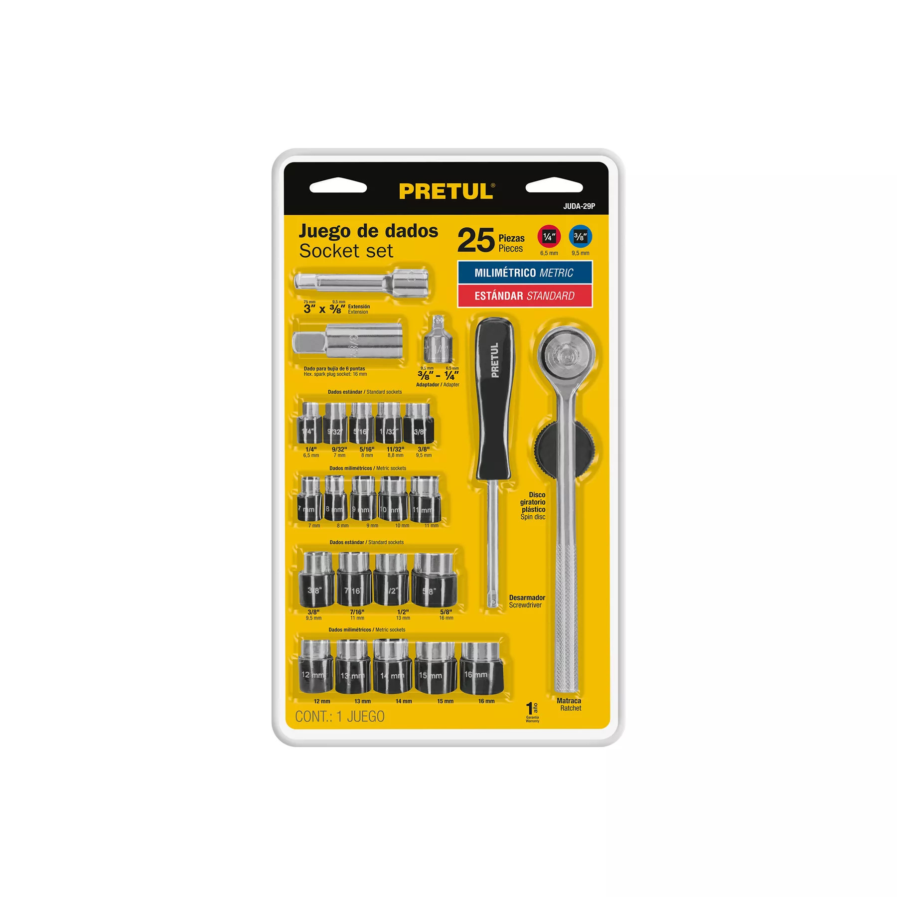 El Juego de 25 Herramientas Pretul es la solución ideal para mecánicos que buscan versatilidad y calidad en sus herramientas. Con medidas de 1/4' y 3/8', este set cubre una amplia gama de trabajos de mantenimiento y reparación.