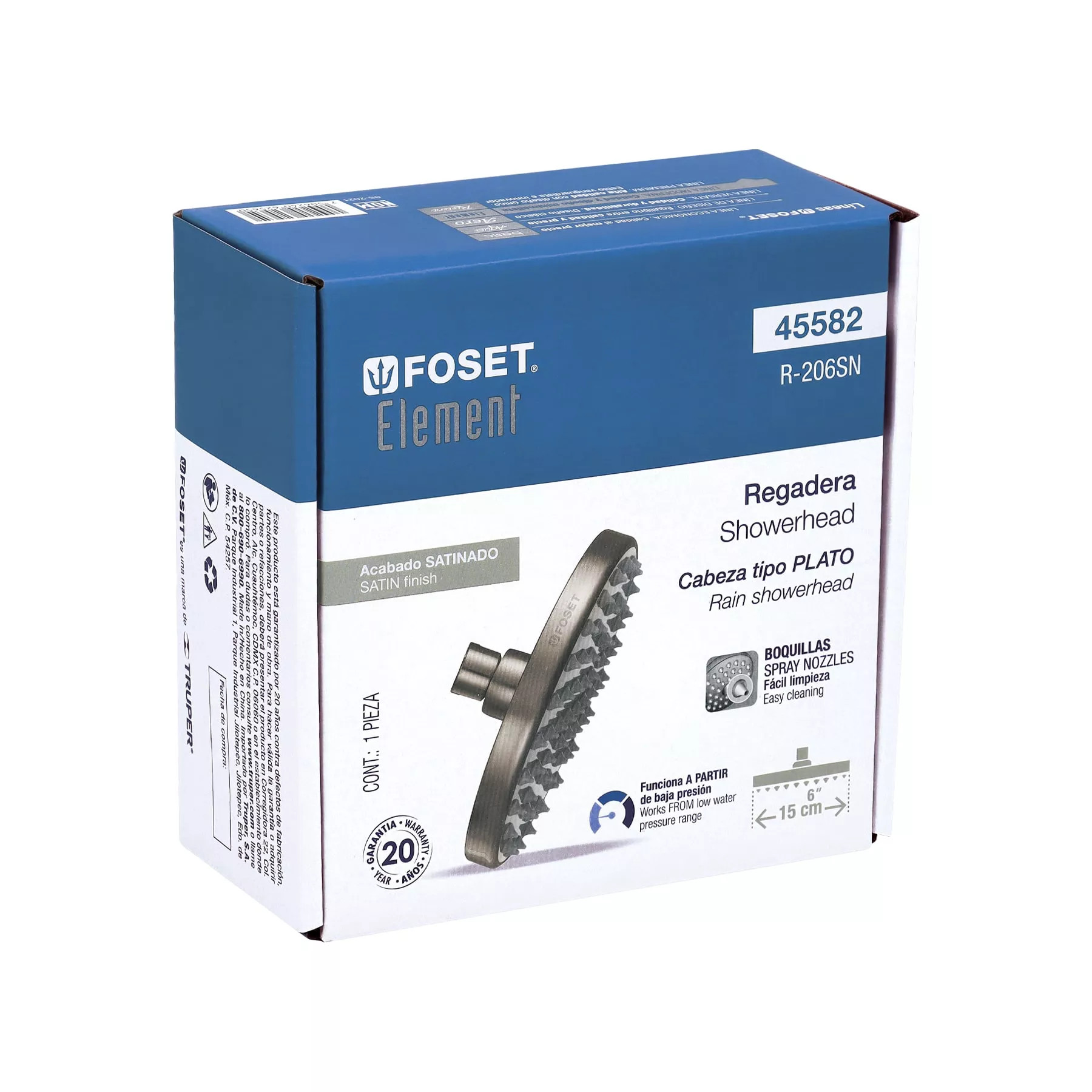 La Regadera satinada de 6" con plato redondo, sin brazo, de la marca FOSET ELEMENT, es la solución ideal para quienes buscan un producto eficiente y estéticamente agradable para sus proyectos de plomería. Diseñada para ofrecer un flujo de agua óptimo, esta regadera es perfecta tanto para uso residencial como comercial, resolviendo el problema del agua dispersa y asegurando un uso más racional del recurso. Su facilidad de instalación y mantenimiento lo convierte en una opción preferida para los profesionales del sector ferretero.