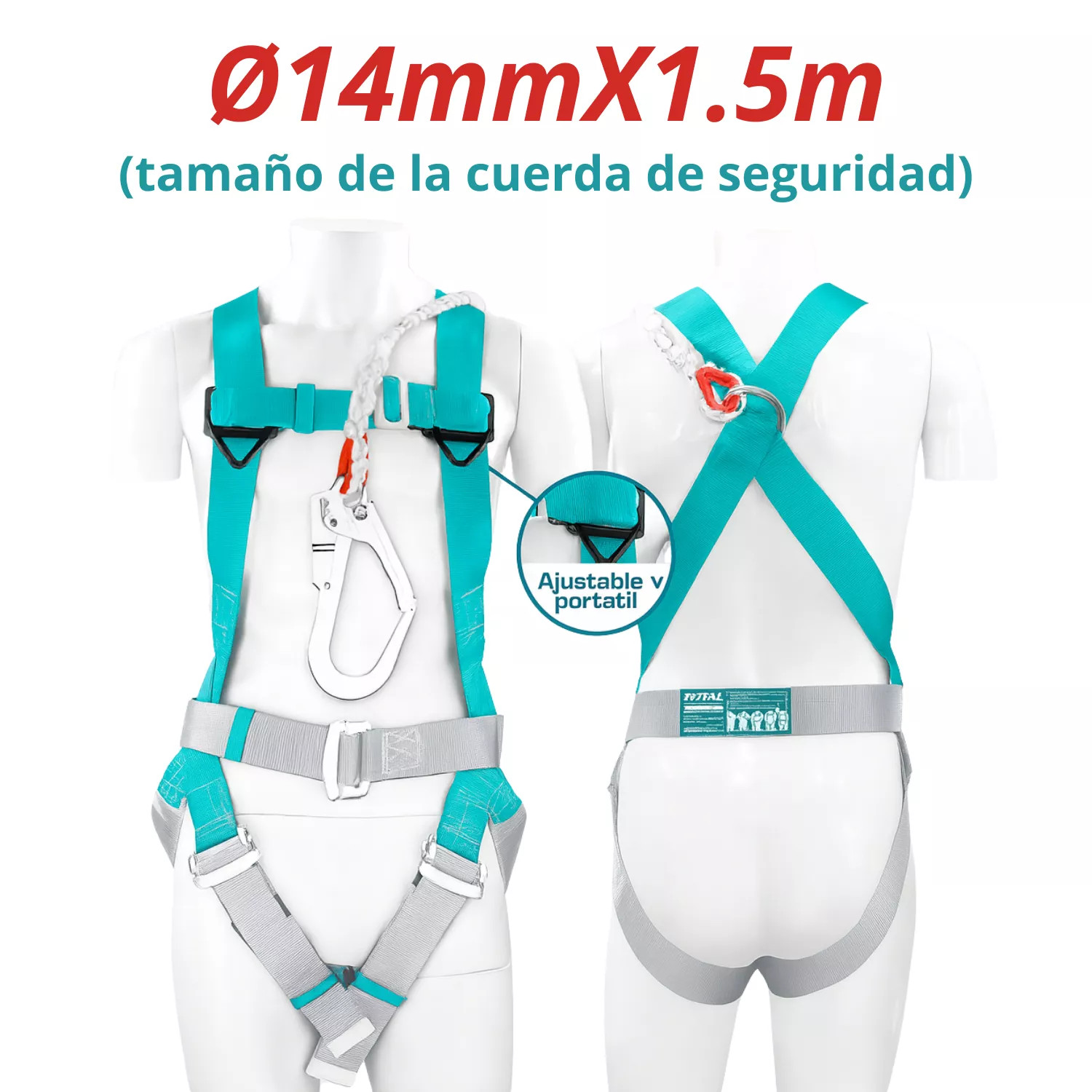 El arnés de seguridad TOTAL TOOLS es un equipo de protección personal diseñado para trabajos en altura, ideal para uso profesional en construcción y mantenimiento. Su diseño ergonómico permite un ajuste firme y cómodo, ayudando a reducir riesgos durante labores exigentes.